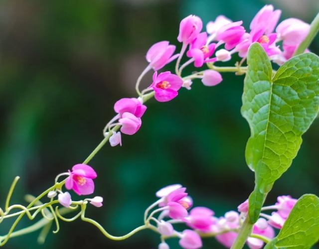 矮性珊瑚藤 / 珊瑚櫻 (Antigonon leptopus 'Compacta'): 這傢伙就特別了!它不像其他兄弟姊妹那樣瘋狂攀爬,而是長成比較低矮、叢生的灌木狀。開花性一樣好,但更適合空間有限的小陽臺、盆栽,或者當前景植物。我試過用大盆養它,不用支架也能開成一個圓滾滾的花球,超可愛!