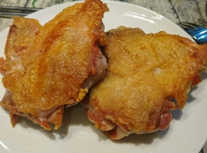 - 醃製印乾:跟上面講嘅方法醃好雞腿排。時間到,拎出嚟放喺架或者碟上風乾表面至少10分鐘(放雪櫃普通格更好)。之後再用廚房紙 用力壓印雞皮,吸走多餘水份。我會用手指摸下塊皮,感覺乾爽冇油膩感先算合格。喺雞皮面均勻薄薄抹上一茶匙油,呢步可以令雞皮更脆更金黃(唔抹都得,但效果差少少)。
