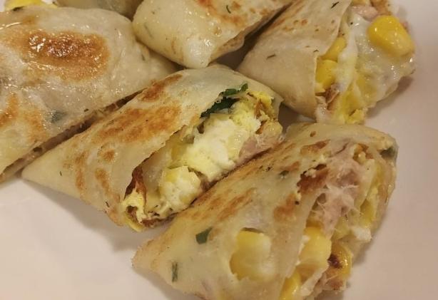 - 在蛋皮上均勻鋪上自製的健康鮪魚醬。