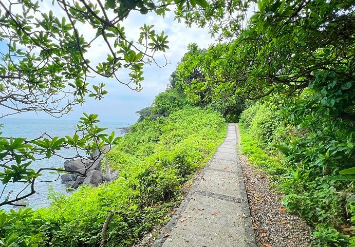 麟山鼻步道的路線很直覺,從入口開始,一路沿著海岸線走,最後會繞回起點附近。我建議從官方入口進去,那裡有標誌,不容易迷路。路線全長約2公里,走起來輕鬆,但我建議逆時針走,因為這樣海景會更早出現,視野更好。