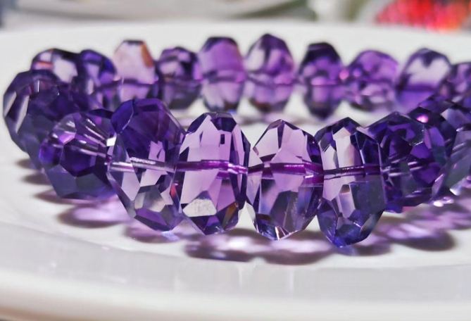 - 看顏色太過"完美"要警覺: 天然紫水晶的顏色分佈通常不均勻,會有深淺變化、色帶(像條紋或斑塊)。如果看到一整串手珠每顆顏色都一模一樣、均勻到像複製貼上,價格又便宜得離譜(比如號稱烏拉圭深紫但一串只要幾百塊),非常高機率是合成或染色的。合成水晶顏色往往死板、缺少天然韻味。太鮮豔不自然的紫色也要小心。