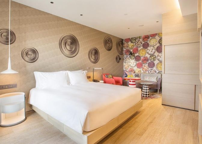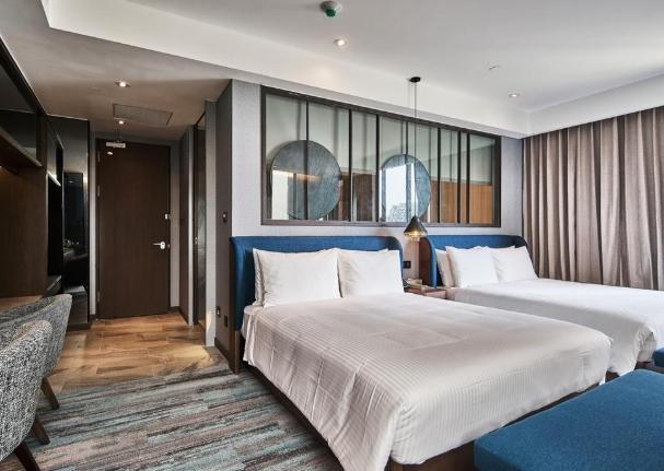 介紹: IHG洲際集團旗下的潮牌!設計超級大膽前衛,靈感來自高雄港都的貨櫃、海洋等元素,運用了很多金屬、彩色玻璃、幾何圖形,公共空間像個藝術館。頂樓高空酒吧Pier No.1是高雄數一數二的熱門景觀酒吧。房間設計感強,充滿驚喜細節。地點就在中央公園正對面。