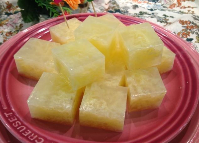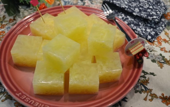 - 水果風味大菜糕: 在煮好的大菜液稍微降溫(約50-60度)但還沒凝固前,加入新鮮水果汁(如百香果汁、檸檬汁)或水果丁(如芒果丁、草莓丁),攪拌均勻後再冷藏定型。這種做法顏色繽紛,帶有水果的酸甜清新,很受小朋友歡迎。宜蘭有些觀光工廠會推出季節限定口味。
