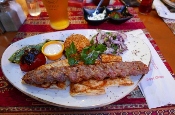 - 烤肉串(Şiş Kebap):選雞肉(Tavuk Şiş)或牛肉(Biftek Şiş)款。就是大塊肉串起來烤,香料醃過但不會過重,吃得到肉的原味和炭烤香,通常配飯或烤蔬菜。視覺和味覺都安心。