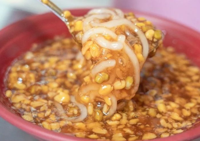 這可是恆春鎮最古早味的冰品甜品!主角是去殼的綠豆仁,煮到綿密軟爛,看起來像「蒜末」而得名。通常熱熱地煮好,可以吃熱的像甜湯,但更多人愛冰的!加上剉冰、Q彈的粉條、軟糯的綠豆、薏仁、脆花生,最後淋上香氣濃鬱的黑糖蜜。口感超級豐富,冰涼消暑,甜而不膩,黑糖香超迷人!