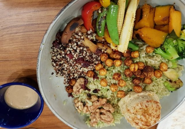- 烤時蔬溫沙拉碗: 份量很大一碗!裡面有多種烤蔬菜、藜麥、堅果、生菜等,淋上清爽的油醋醬或胡麻醬,健康無負擔。