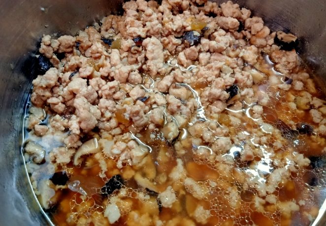 - 加入高湯/水: 倒入熱的高湯或水。強烈建議用熱的,湯滾得快,雞絞肉才不會煮老變柴。
