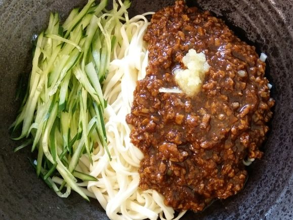 - 豪邁地舀上幾大匙熱騰騰、香噴噴的 自製炸醬!