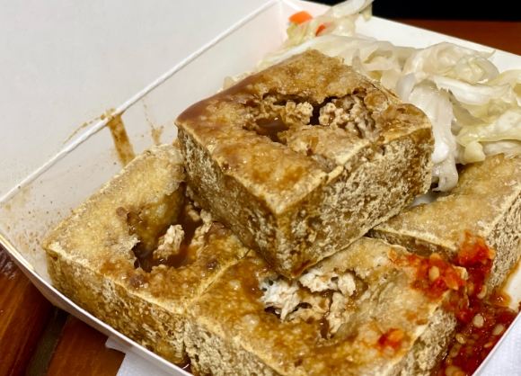 - 特色與亮點: 臭豆腐愛好者看過來!這裡的豆腐炸得外皮金黃酥脆,像餅乾一樣「咔呲」作響,裡面卻保持著驚人的軟嫩多汁(像豆花口感!)。臭味算中等,大眾接受度高。自製的台式泡菜酸甜脆口,淋上蒜蓉醬油膏,再來點辣椒醬,經典不敗!