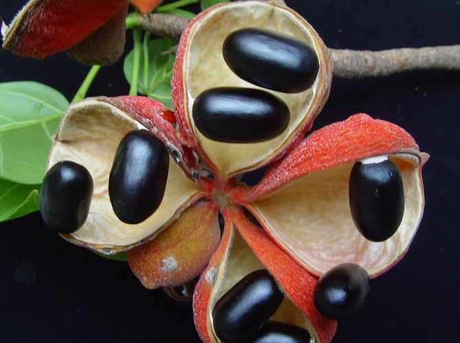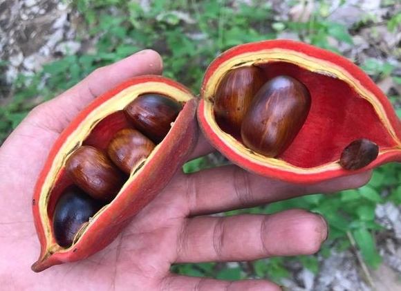 - 種子(我們吃的部分): 種子通常是1-3顆(所以學名 monosperma 其實不太準確),烏黑發亮,橢圓形或近似圓球形,大小像鴿蛋或更大(直徑約1.5-3公分)。種子外面包裹著一層淡褐色的種皮(薄膜)。煮熟或烤熟後,種皮會裂開,露出裡面蛋黃色或淡黃色的種仁(胚乳),質地粉糯,口感介於栗子與銀杏之間,味道則是淡淡的甜與堅果香。因為種子烏黑發亮,加上裂開的紅色果莢形狀,古人覺得像鳳凰睜開的眼睛,所以得到「鳳眼果」這個充滿詩意的別名!也有人覺得像漆器,叫它「七姐果」(七夕相關)。我覺得剝開果莢看到烏黑發亮的種子那一刻,真的很療癒,像發現寶藏一樣!
