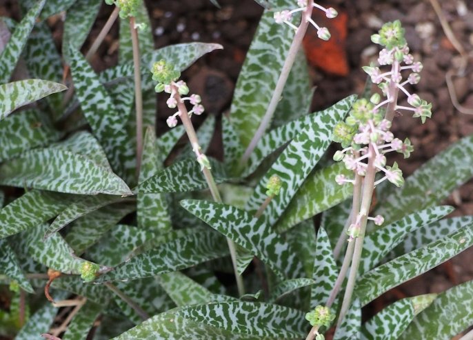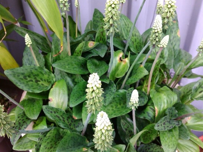 - 紫斑油點百合 (Ledebouria socialis 'Silver Squill'): 這算是超級大眾臉,最容易買到。它的特色就是那卵圓形或橢圓形的肉肉葉子,葉面是帶銀灰綠的底色,上面佈滿了深深淺淺、大大小小的深紫褐色斑點,像潑墨畫一樣,超級耐看。葉背則是漂亮的紫紅色。這個品種算是適應力比較強的「油點百合」代表,對環境要求相對沒那麼苛刻(當然,基本要求還是得達到)。