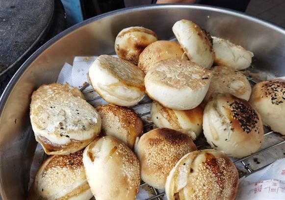 - 特色與亮點: 每次經過這攤,那炭烤香氣總是讓我走不動路!師傅在傳統桶爐邊現包現烤。外皮是厚實的芝麻酥皮,烤得金黃焦脆。內餡是醃漬入味的豬後腿肉(蔥燒口味),加入大量新鮮青蔥。最厲害是咬下去那一瞬間, 「滾燙的肉汁」 瞬間爆出,伴隨著胡椒辛香和青蔥甜味,燙口卻過癮!烘烤的火候控制是關鍵。