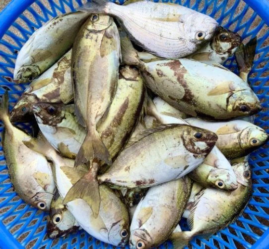 後來才知道,臭肚魚其實是「籃子魚科」魚類的通稱,臺灣沿海常見的有褐籃子魚(俗名「象魚」)、點籃子魚(「星臭肚」或「點臭肚」)和黃斑籃子魚(「金錢魚」或「黃斑臭肚」)。它們最典型的特徵就是背鰭、臀鰭和腹鰭上那尖銳又帶有毒腺的硬棘(絕對是釣魚人最痛恨的魚種之一,被刺到痛到會飆淚!)。這也是它們在潮間帶生存的武器。