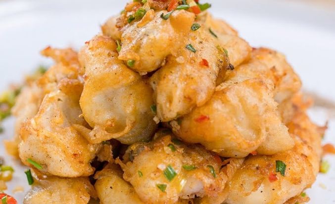 - 裹上酥粉: 將醃好的臭肚魚塊均勻地沾上一層地瓜粉(薄薄一層即可,裹太厚容易脫落)。沾好後稍微放置一下,讓粉回潮(這樣炸起來粉殼更牢固酥脆)。這個步驟決定酥脆度!(個人心得: 單純用地瓜粉效果最好,又酥又不易軟!)
