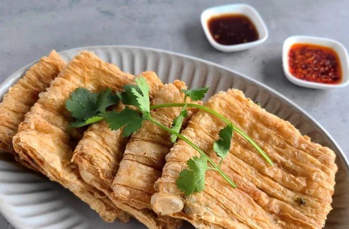 記得那次去九份玩,看到櫥窗裡炸得酥脆灑滿花生粉的豆包,天人交戰五分鐘⋯最後買了一個,要求老闆醬料減半,自己多買一盒燙青菜配著吃。雖然還是有點罪惡,但至少比直接嗑掉一大顆包餡炸豆包好多了(自我安慰中)。