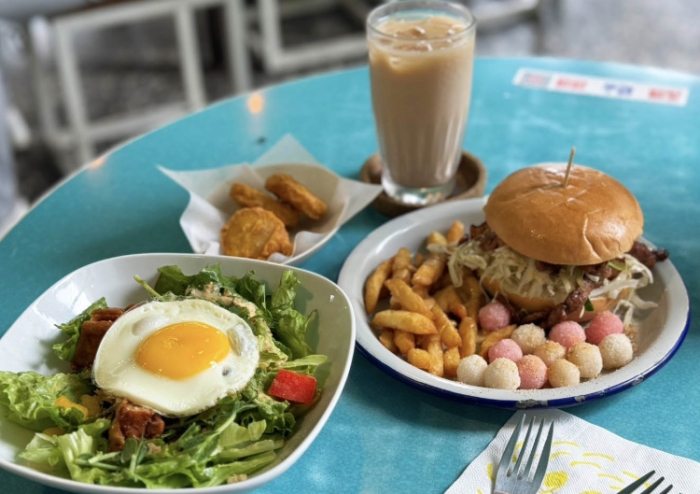 我最念念不忘的是「一堡吃兩餐」(現在選單名可能不同了,類似概念的漢堡)。那個豬排堡超級厚實,豬排很嫩,搭配滑嫩的炒蛋、生菜和特調醬汁,夾在烤得微酥的布里歐麵包裡,份量驚人,真的可以當兩餐吃!他們的「男生沙拉」也很有名,是走美式路線的大份量沙拉,配菜豐富,搭配的麵包也好吃。飲料也常有季節限定,像草莓牛奶就很受歡迎。