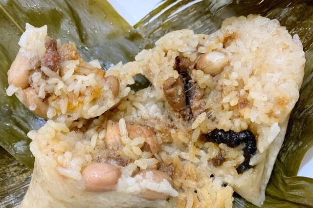 心得:粽子個頭不小,米飯軟糯好吃,肉塊是三層肉,肥瘦適中,滷得入味。整體調味適中不會過鹹,搭配微甜醬油膏很對味。喜歡花生煮得夠軟爛。缺點:蛋黃有時會有點偏乾。