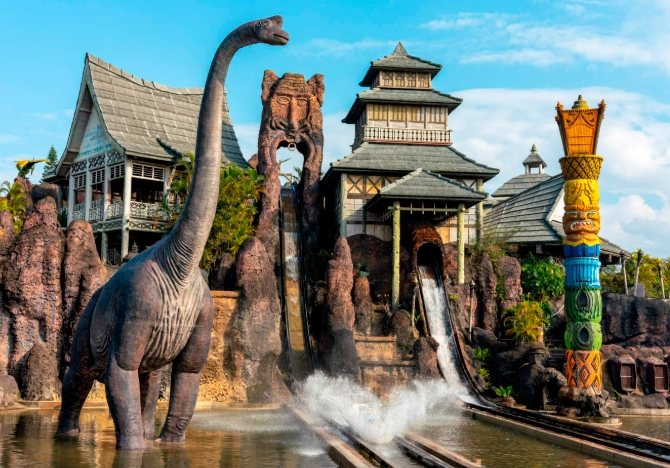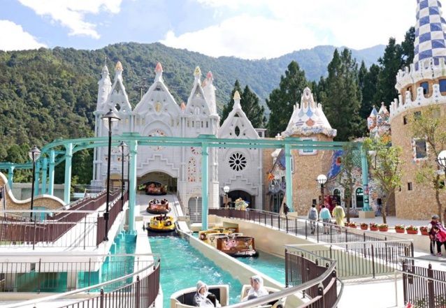 - 聖托里尼山城: 剛剛說了,拍照打卡聖地!裡面也有輕食、紀念品店。 「飛越愛情海」 (濕身雲霄飛車) 也在此區。藍白建築真的很有度假感。