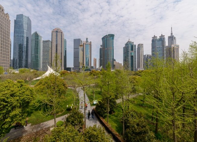 摩天大樓腳下的草原!帶杯%Arabica咖啡躺在斜坡上看「開瓶器大樓」(上海環球金融中心暱稱)