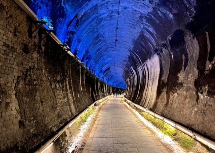 A: 隧道裡面確實比較涼爽濕潤(畢竟是山洞),但完全不會陰森可怕!七彩的燈光打在古老的磚牆上,反而營造出一種奇幻浪漫的氛圍,一點都不嚇人。地面雖然是礫石枕木,但寬敞好走。只要帶著手機手電筒照明腳下,慢慢走,享受那份穿越時空的感覺,非常舒服。怕黑的話就跟著其他遊客一起走,人氣還挺旺的。