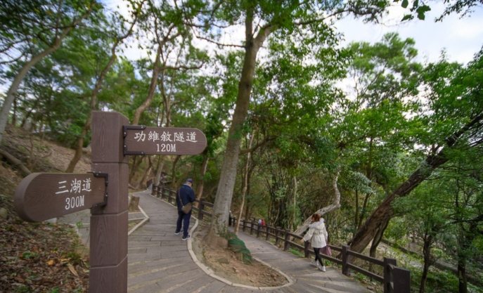整個環狀系統步道其實有好幾條(紅線、藍線、黃線),互相連線。但大家最常走的「功維敘隧道」主步道,從北口隧道到南口貓貍山公園附近,「單程距離大約是1.5公里左右」。來回走一趟,加加減減也差不多3公里,運動量剛剛好。 - 步道難度: