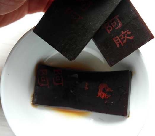 • 取一小塊阿膠(約指甲片大小),放入杯中加熱水攪拌。好的阿膠應該能完全溶解,溶液呈澄清的淡琥珀色,冷卻後會凝結成凍。溶解後有雜質、渾濁、或無法凝結,品質堪慮。劣質膠可能像煮不爛的塑膠片…