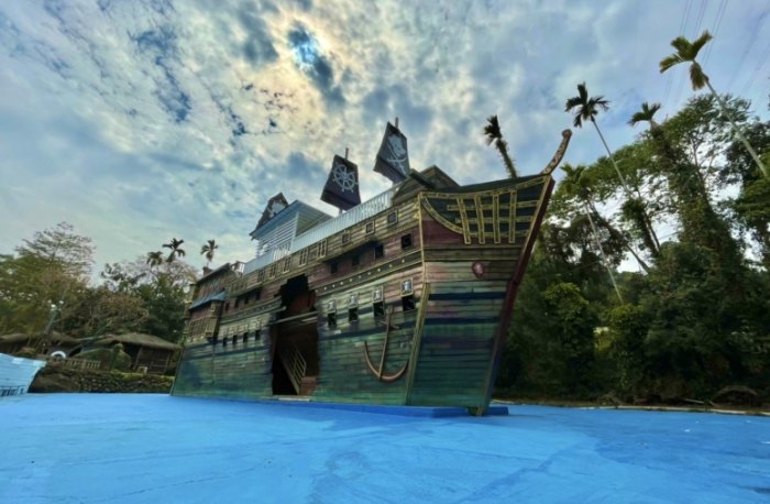 - 巨無霸海盜船 (主船造景): 這是整個園區的靈魂!也是最高人氣打卡點。船身巨大,細節超多,從船頭到船尾都能拍出不同感覺。一定要走上甲板,假裝掌舵,後面是埔里山景,拍起來超有fu。船船船艙也可以進去探索,裡面佈置成尋寶、囚犯的場景,稍微暗一點,很有氣氛(膽小的小朋友可能需要大人陪)。光是這艘船,就可以謀殺你手機一半電量!我覺得黃昏時拍,燈光打上來更有神秘感。