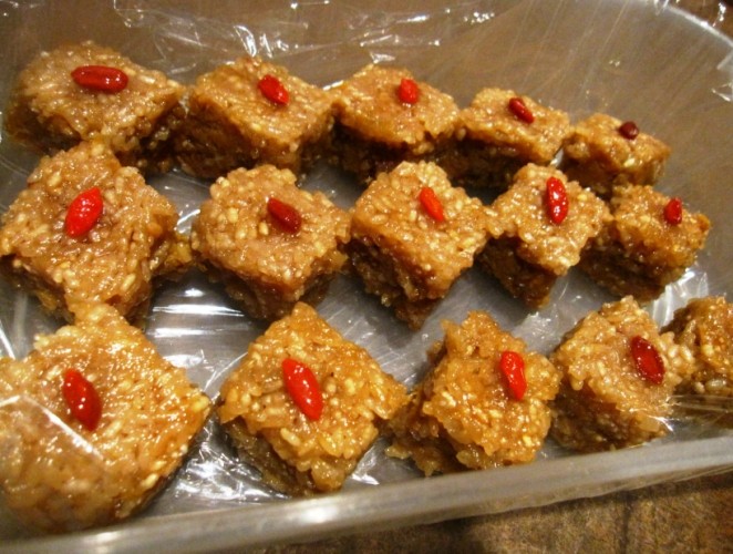 - 介紹: 這是非常古早味的甜點。用糯米蒸熟後,拌入糖、芝麻或花生粉(有時會加點紅豆),壓緊成長條狀,再切片販售。口感是軟糯中帶點Q彈,甜度恰到好處,帶著米香和芝麻/花生香。冰冰涼涼的吃很舒服。通常是一位阿婆推著小車在市場特定角落賣。