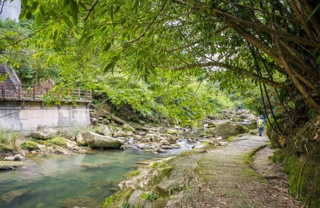 - 前行:沿著溪流右岸的平緩步道往上游走(鋪設良好,寬敞好行)。
