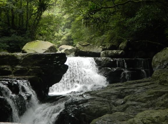 你知道嗎?這裡以前可是林務局的「滿月圓造林中心」呢!主要任務就是培育樹苗、復育森林。後來因為景觀實在太獨特、生態資源太豐富了,才華麗轉身成為國家級的森林遊樂區。這也解釋了為什麼園區內的步道設施維護得相當不錯(以國家森林遊區的標準來看),走起來相對舒適安心。除了壯觀的瀑布群,這裡同時也是觀察中低海拔森林生態的絕佳教室。柳杉林筆直參天,走在其中光影交錯,很有靈氣;天然闊葉林裡則是生意盎然,各種蕨類、苔蘚、附生植物把樹幹、石頭都打扮得綠意茸茸。運氣好的話,抬頭或許能瞥見臺灣藍鵲劃過天際的那抹寶藍,低頭則可能發現斯文豪氏赤蛙在溪邊石縫間跳躍(安靜點觀察,機會更大喔!)。對我這種貪心的人來說,一次行程能同時滿足看瀑布、森呼吸、還能偷學點自然知識,CP值真的很高!當然啦,滿月圓森林遊樂區的精華,絕對是那幾座姿態各異的瀑布,後面我會好好介紹!
