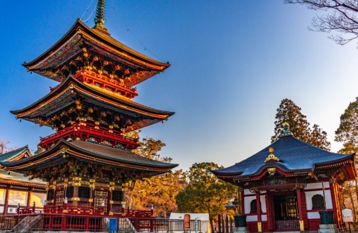 - 三重塔:優雅的地標。 穿過仁王門,沿著參道走沒多遠就會看見這座美麗的三重塔(重要文化財)。朱紅色的塔身在藍天或綠樹映襯下特別耀眼。它建於江戶時代中期,是關東地區數一數二美的三重塔。傍晚點燈時分更是夢幻。繞著塔走一圈,欣賞不同角度的美。