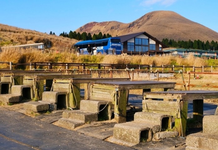 交通:與前往阿蘇火山博物館、草千里完全相同。從博物館或草千里步行即可輕鬆到達(幾分鐘路程)。