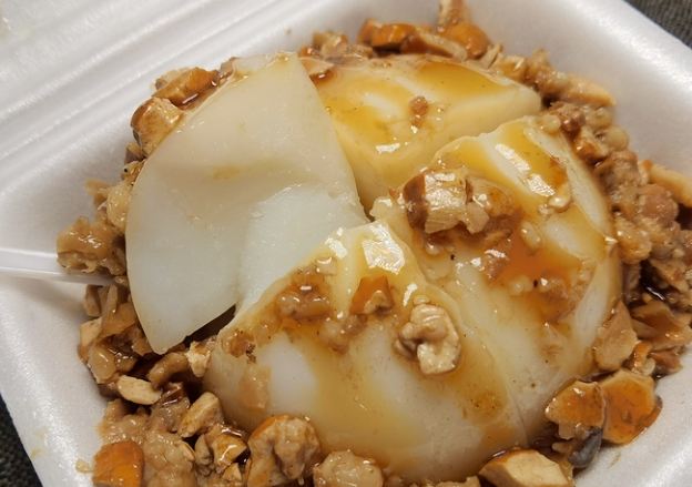 - 特色與亮點: 又是一個沒有招牌的超級隱藏版!就在南竹路某個巷子口的小攤車(靠近南崁高中)。碗粿是傳統在來米漿做的,口感紮實綿密,帶著單純的米香。裡面藏著鹹香的肉燥、香菇、鹹蛋黃,淋上特調醬油膏和一點蒜泥,簡單卻讓人回味無窮。