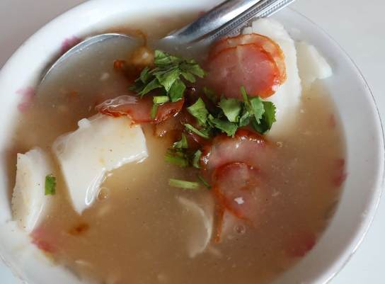 介紹: 這嚴格來說不是在市場"樓上"的主建築體內,而是在市場周邊(步行1分鐘內),但絕對是東港特色早餐的代表,逛市場前後必吃!東港肉粿跟你想像中的粿仔不一樣,它是軟Q的米粿切片,淋上濃稠的勾芡羹湯(以大骨、米漿熬製,味道獨特),上面鋪滿香腸片、三層肉片(滷過)、蝦猴(一種小蝦米)和香菜。吃之前一定要加點店家特製的辣椒醬(靈魂所在!)。羹湯的鹹香、肉的滋味、米粿的Q彈,加上辣醬提味,整體風味非常飽滿豐富而且很「東港」。我個人超愛!當早餐吃飽足感十足,開啟戰鬥的一天。