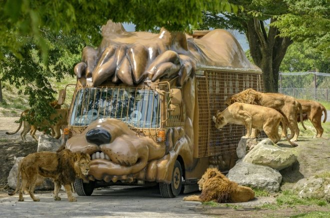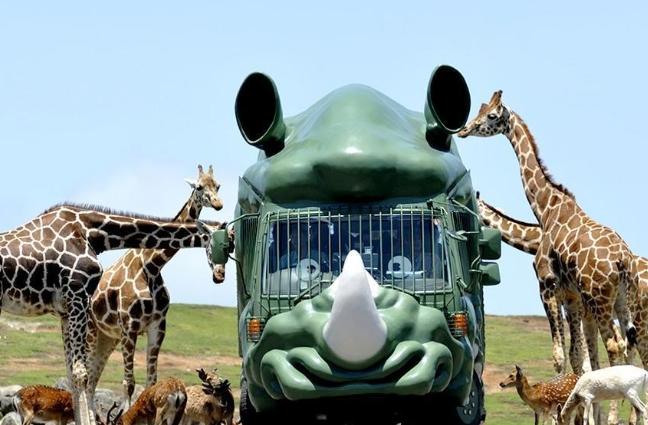 - 這是什麼? 就是一輛特殊設計、窗戶有鐵柵欄的遊園巴士,直接開進獅子、熊、大象、長頸鹿等猛獸和大型動物的放養區!