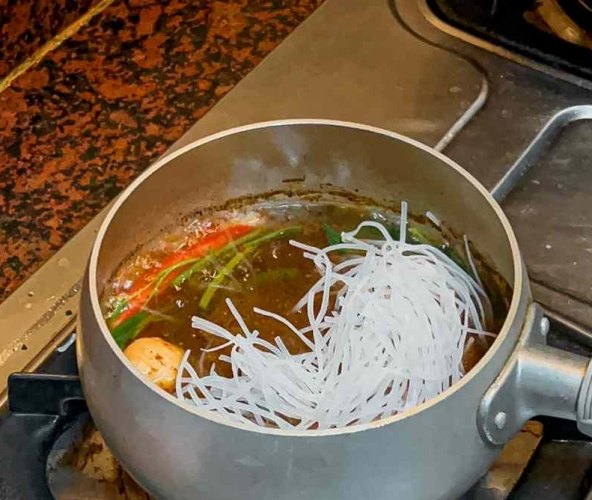 記得 泰國船麵 的湯頭本來就是濃縮的滋味,要夠味才對!調好味道後,關火備用。香料包可以撈掉