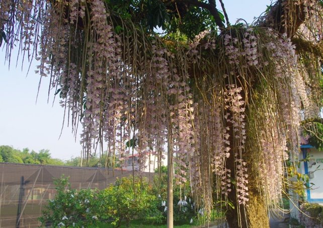 簡單說,石斛蘭瀑布 就是把石斛蘭這種原本附生在樹上的蘭花,透過巧手種植在高大的樹幹或棚架上,讓它的花莖自然垂墜,形成宛如紫色、粉紅色或白色瀑布的壯觀景象。新社,特別是「石斛蘭瀑布」最經典的區域—「安妮公主花園」週邊,還有「百菇莊」附近,不只是種植面積廣大,更是種植者多年經驗累積的成果,才能讓花開得如此密集、氣勢磅礡。石斛蘭瀑布 的規模和視覺震撼力,其他地方真的難以匹敵。想想看,當你站在數層樓高的花瀑底下,抬頭盡是層層疊疊的浪漫花穗,陽光穿透花瓣灑落點點光斑… 這畫面,美得太不真實!
