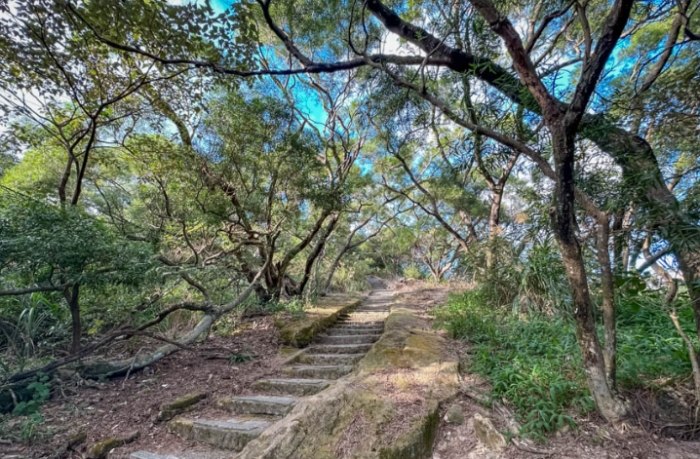 - 這段就是考驗腳力的時候了!一路向上的石階,兩旁是茂密的樹林。別急,調整呼吸,慢慢走。途中偶爾會有小平臺可以喘口氣。大約爬個20-30分鐘,你會感覺坡度變緩,看到樹林透光,表示快要上稜線了!