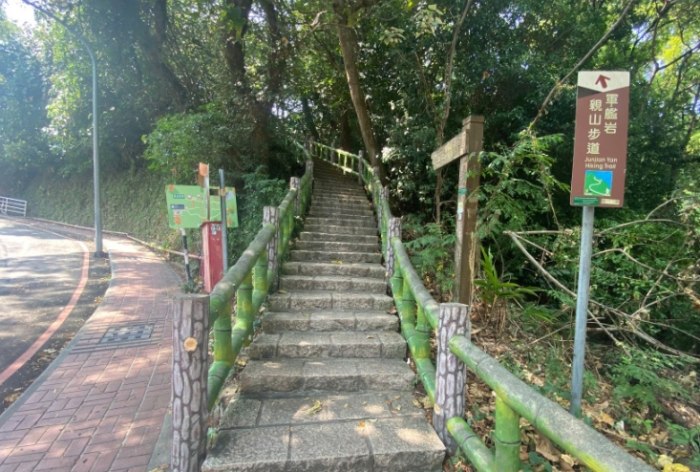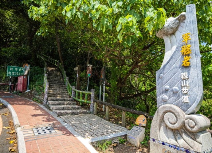 - 進入陽明大學校園,沿著主幹道走或跟著「軍艦巖」的指標前進。會遇到一個明顯的石階步道入口(通常會有地圖看板),這裡就是起點啦!開始向上爬吧!