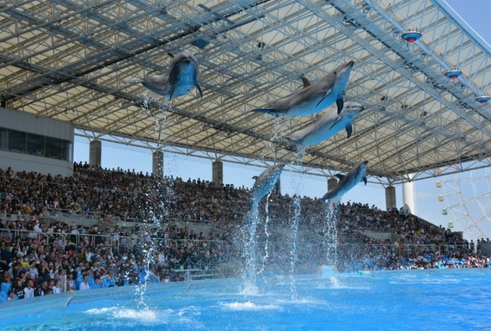 - 我的體驗: 表演本身的技巧和華麗程度,可能比不上一些專門的海豚劇場(例如沖繩海洋博公園那個超大的),但 「背景」實在太加分了! 當海豚從表演池躍入後方深邃的主水槽,或是偽虎鯨巨大的背鰭劃過表演池與主水槽交界處時,那種真實海洋的遼闊感瞬間湧現,非常特別。記得 提早至少20分鐘以上去排隊 搶中間偏上的位置(太前面視角太低,看跳躍反而看不全),表演場是露天的,夏天記得防曬,冬天記得保暖!風有時頗大。