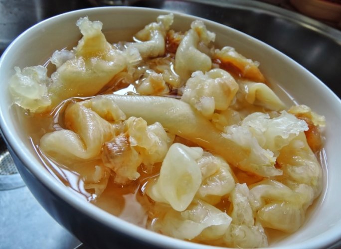 - 徹底清洗: 泡發完成後,把花膠取出,用流動的清水徹底沖洗內外。仔細檢查,特別是內層黏膜,有時會有深色的薄膜或殘留的血管痕跡(尤其公肚比較常見),要溫柔地刮乾淨,這是腥味的主要來源之一。洗乾淨後,就可以切塊或整片拿去烹調了。