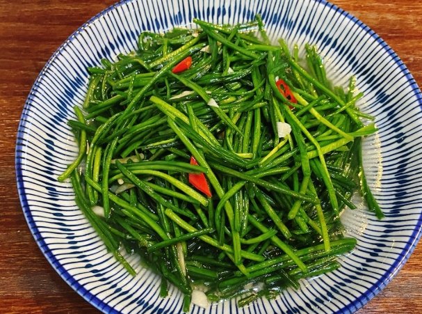 - 汆燙保色保脆: 如果想做涼拌水蓮,汆燙是必要的步驟。訣竅是:鍋中水要大滾,水量要足夠,一次不要下太多(避免水溫驟降)。水蓮下鍋後,看到顏色變得更翠綠(約15-30秒)就立刻撈起!馬上放入冰開水或冷水裡「冰鎮」。這步驟能讓口感更脆,顏色也更漂亮。瀝乾水分後再進行涼拌。燙太久一樣會軟掉變黃!水蓮營養也容易流失到水裡。