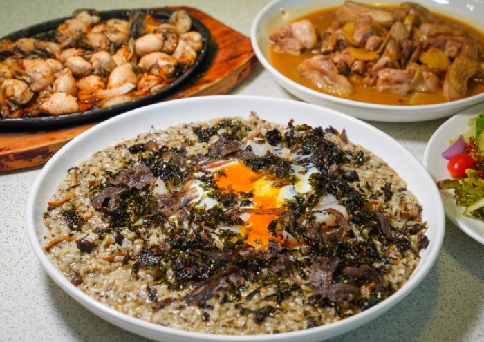 - 招牌肉粿 (大碗 NT$60):濃稠的米漿湯底,帶著淡淡的米香和蝦米、肉燥的鹹香。裡面有切片的滷三層肉、香腸、蝦猴(一種小蝦乾)。吃的時候加上店家特製的醬油膏和蒜泥。米漿湯看似濃郁卻不死鹹,配料增添口感,整體風味獨特,鹹香溫潤。一定要試試看!是東港人的日常早餐。
