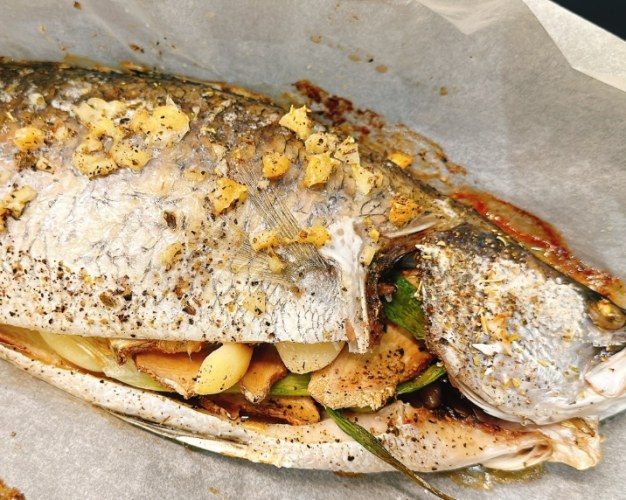 - 包起來烤更嫩: 用鋁箔紙或烘焙紙把魚連同蔬菜(櫛瓜、彩椒、蘆筍等)包起來烤(俗稱Papillote),能鎖住蒸汽,讓魚肉更鮮嫩多汁,蔬菜也充滿魚鮮味。這樣一盤,有魚有菜,營養均衡又方便!完美呈現「鱸魚營養」與蔬菜纖維的結合。