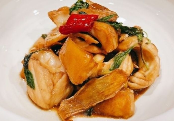 - 最後!豪邁地撒入滿滿的「九層塔」,立刻蓋上鍋蓋,關火!讓鍋子的餘溫把九層塔燜軟、燜出香氣。等個30秒左右,開蓋拌勻,香味直衝腦門!搞定,上桌!