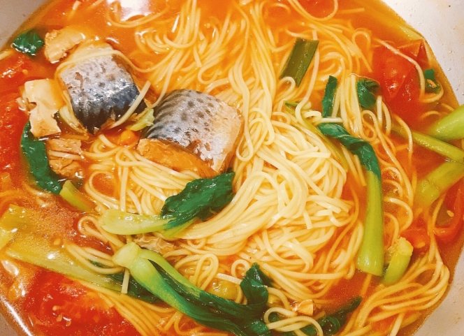 - 起鍋開動! 確認麵條熟了,青菜也翠綠了,就可以關火啦!馬上把整鍋香噴噴的 茄汁鯖魚麵 盛到碗裡。最後別忘了撒上一把新鮮的蔥花!視覺、嗅覺、味覺大滿足!