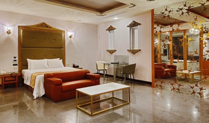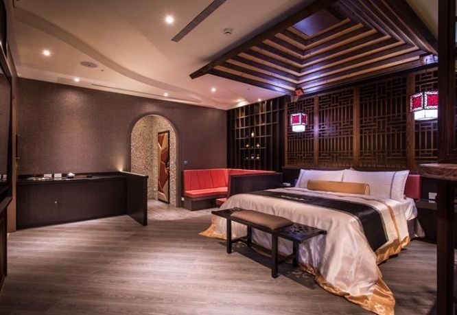 - 房型與價格: 顧名思義,主打的就是華麗宮廷風!「龍鳳呈祥」主題房 ($3200起),一打開門真的會「哇」出來,雕龍畫鳳的床架、龍椅沙發,浮誇得很到位 (笑)。喜歡大空間的可以選「紫禁之巔」($4500起),除了華麗臥榻,還有專屬的 KTV 室和獨立蒸氣淋浴間,一群人開趴也很適合。