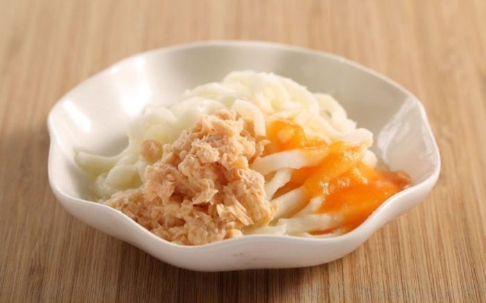 開始嘗試蛋白質!地瓜提供甜味和維生素A,雞肉補充優質蛋白質。
